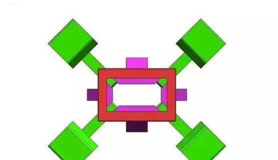 碰到此類(lèi)產(chǎn)品,我們首先會(huì)考慮能不能做斜頂,但通過(guò)分析,做斜頂4個(gè)角落位置的倒扣無(wú)法脫離(箭頭方向做斜頂) 2.方案 斜頂無(wú)法完全脫倒扣,我們只能考慮能否用斜頂+內(nèi)滑塊的方式進(jìn)行設(shè)計(jì)。如下圖所示,綠色部件為內(nèi)滑塊,粉紅色部件為斜頂。