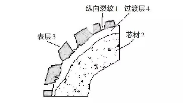 (1)縱向斷裂處空隙的表面積大于表層金屬層3表面積的5%而小于40%,縱向斷裂處的裂紋形狀呈不規(guī)則狀態(tài)分布。過渡層的鋅原子由內(nèi)向外呈線性增加分布、銅原子由內(nèi)向外呈線性減少分布。這種銅鋅含量的分布方式,使得表層金屬和芯材金屬融為一體,減少了表層金屬的脫落,有助于切割。