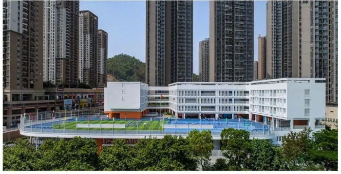 深圳市南灣實驗小學 “深圳市南灣實驗小學”由建學全過程設計,位于深圳市龍崗區南灣街道,用地面積9213.65㎡,總建筑面積22856㎡,容積率為2.48。通過對嶺南民居特點的總結歸納,提出綠色設計“六字法(綠、蔭、透、水、材、能)”,并將這一理念貫穿到設計全過程。適應氣候,充分利用場地高差關系,因地制宜打造一座立體、多層次的綠色校園。