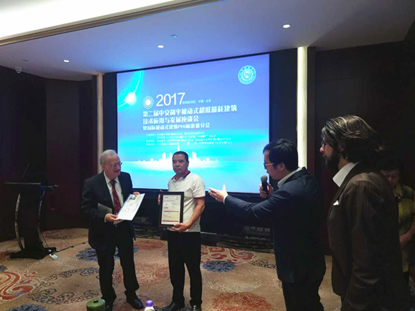沃爾夫岡?菲斯特教授為中國首個“勘森裝配式被動式超低能耗木結構樣板房”頒發PHI國際認證證書