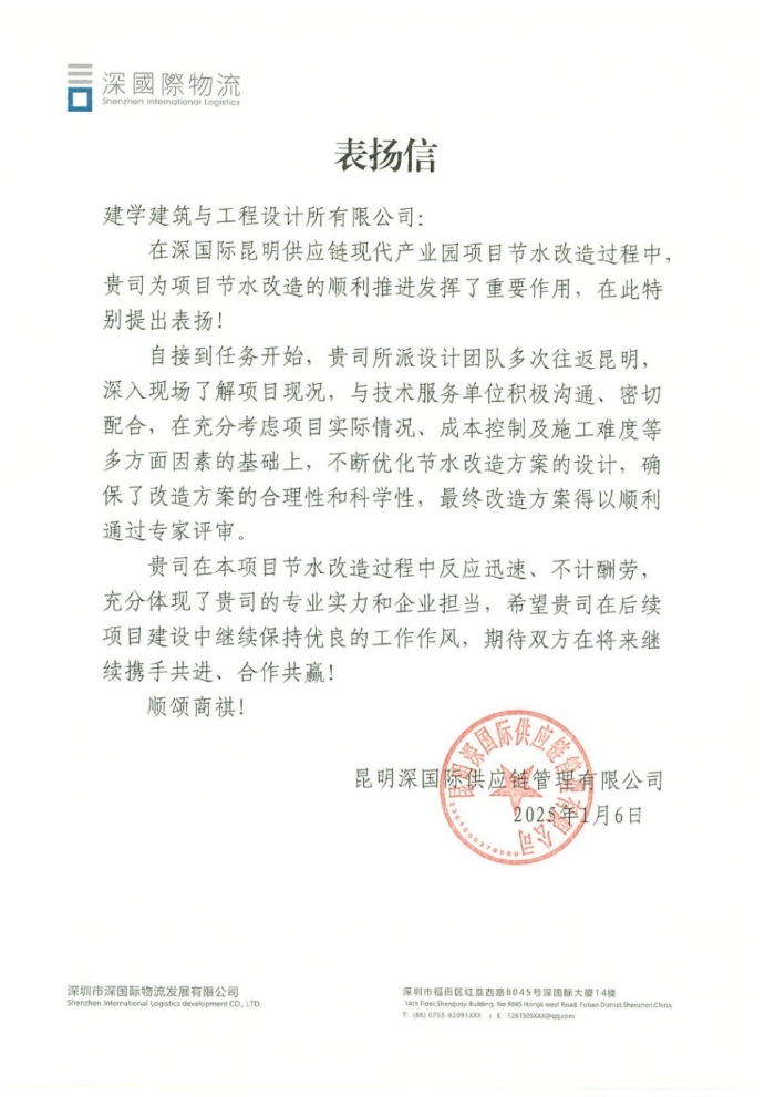 建學上海分公司收到昆明深國際供應鏈管理有限公司表揚信 |