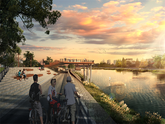 利用西險大塘堤岸與地面的高差,將新橋路 - 孫家弄段的苕溪路適度下穿。下穿道路上蓋綠化,形成寬闊的沿溪公共空間。綠化堤頂呈北高南低的坡狀,即隔絕了道路對老鎮的干擾,也形成從老鎮到苕溪堤岸的自然過渡,每條南北向歷史街巷都能無障礙地直通堤岸。