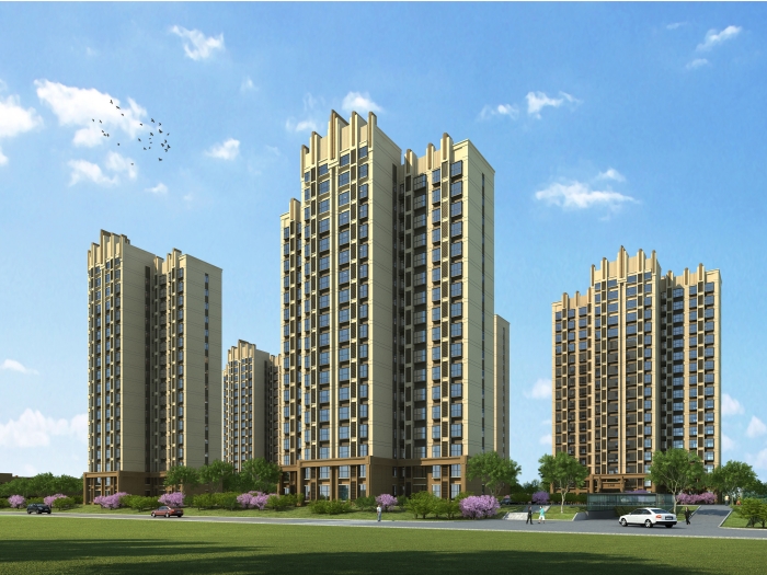 地塊總設置五棟高層住宅,一棟2層配套。地塊北側設置三棟高層住宅,自左向右均為17層;地塊南側設置兩棟高層住宅,均為17層,總體布局特點為低密度、大間距,使地塊內每棟住宅都能獲得充分的日照時間。以及良好的視覺效果,為城市綠地提供多層次的景觀效果。同時,在地塊的西側設置2層的配套公建,采用現代的建筑風格。